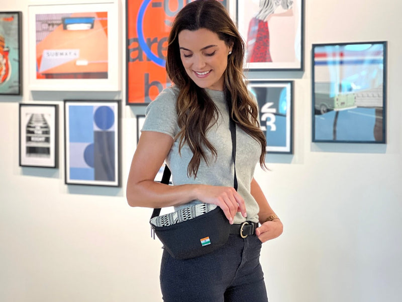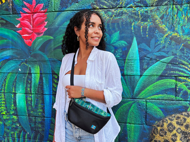 The main surface is a water resistant PET eco-tech fabric made from 100% recycled plastic bottles. The back panel has a discrete zip pocket for passport, cash or travel documents close to the body. The main compartment is lined with water-resistant rip-stop lining and features a built-in zipper mesh pocket and keychain clip.