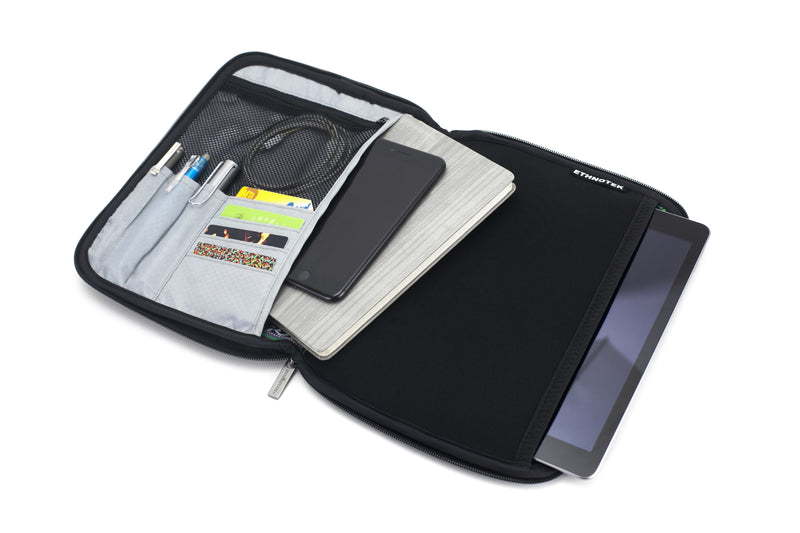 The Chiburi Folio is a stylish iPad Pro 10.5 case with pencil holder scaled to also fit A5 size notebooks and has a built-in organizer for pens & pencils, cables, and business cards. There is a center spine zipper pocket to safely secure currencies or small paper documents.